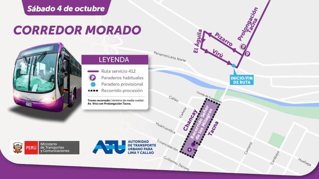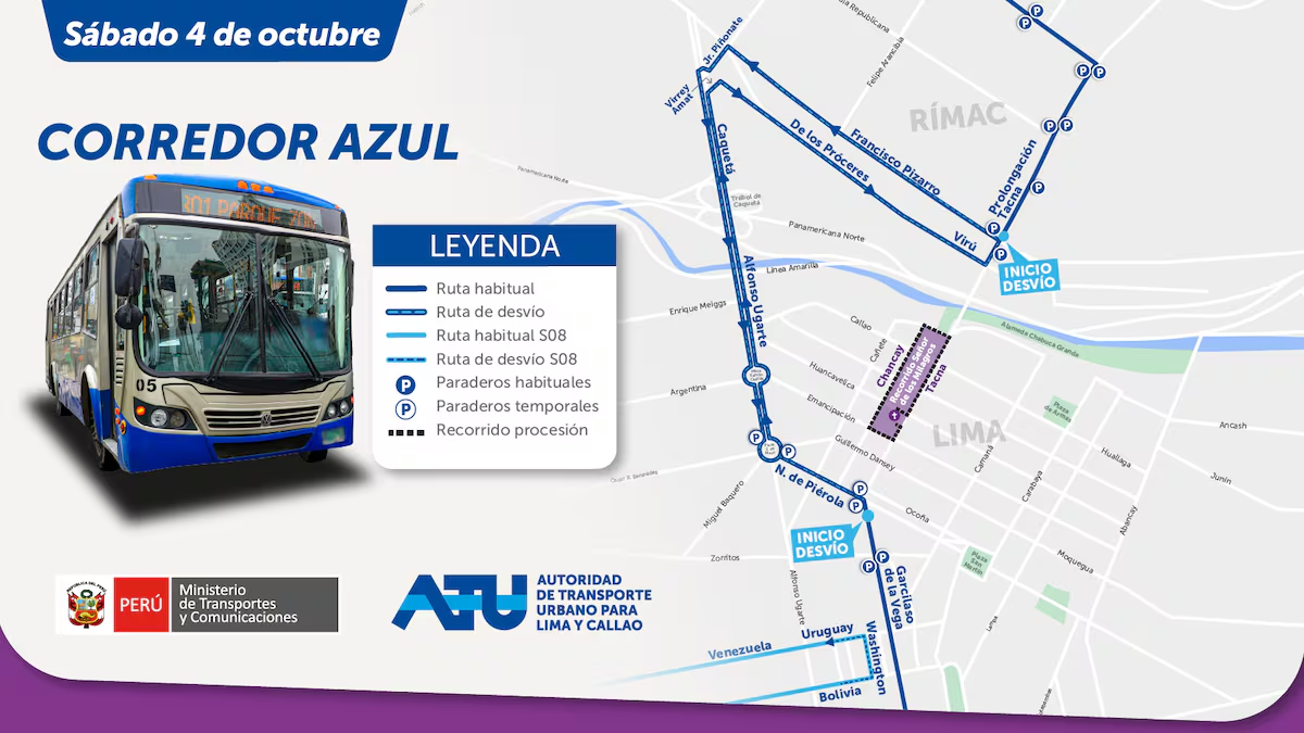 La Autoridad de Transporte Urbano para Lima y Callao (ATU) informó que este sábado 4 de octubre se aplicarán desvíos y modificaciones en los servicios de transporte público debido al primer recorrido procesional del Señor de los Milagros. La actividad comenzará al mediodía en el Santuario de Las Nazarenas, avanzando por calles del centro de Lima con cierres progresivos a cargo de la Policía Nacional.