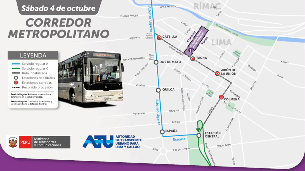 El Metropolitano modificará parte de sus servicios: el regular A circulará por la avenida Alfonso Ugarte con paradas solo en Dos de Mayo, Quilca y España, mientras que el regular C operará únicamente hasta la estación Central. En tanto, las estaciones Colmena, Jirón de la Unión, Tacna y Castilla permanecerán cerradas hasta la culminación de la procesión.