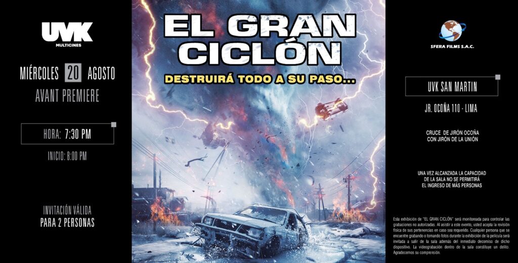 Este 21 de agosto, las salas de cine a nivel nacional se preparan para recibir EL GRAN CICLÓN, una superproducción que combina suspenso, acción y efectos visuales de última generación. La cinta promete una experiencia cinematográfica única, con escenas cargadas de adrenalina que sumergirán al espectador en el corazón de una tormenta sin precedentes.
