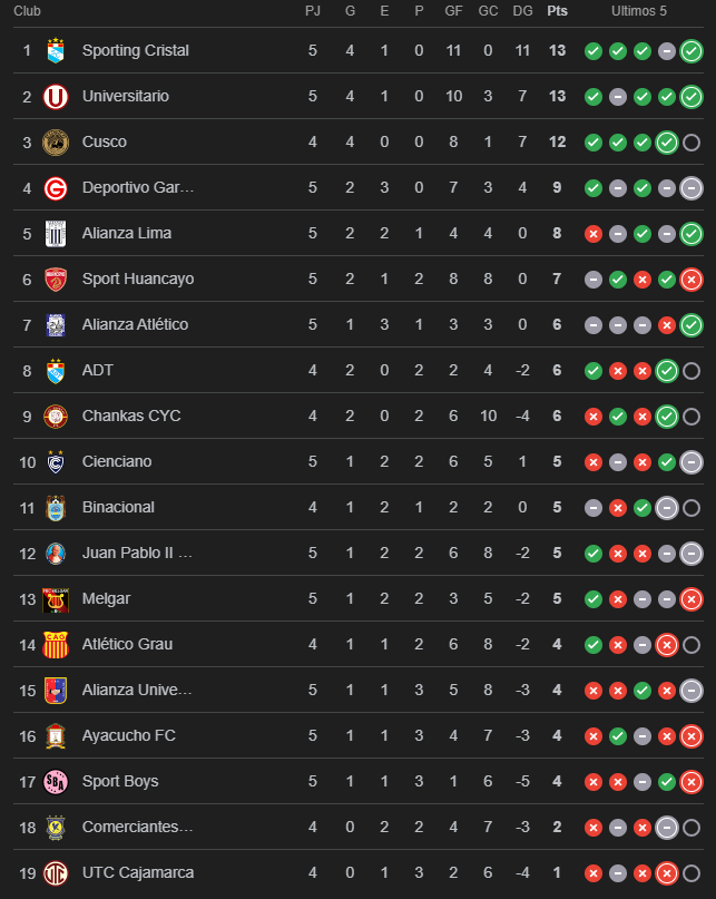 RESULTADOS DE LA FECHA 5 DEL CLAUSURA: (Descansó Cusco FC)