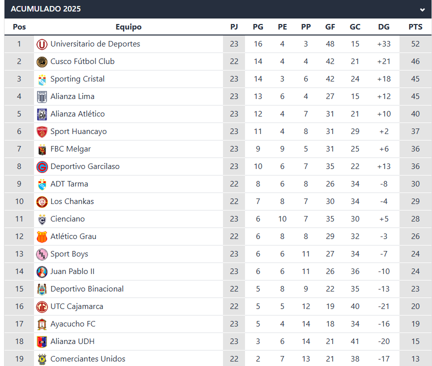 Por su parte, Alianza Lima logró un importante triunfo a domicilio ante Ayacucho FC. En un partido trabado en el Estadio de Las Américas, los íntimos se impusieron 1-0 con un penal ejecutado por Pablo Ceppelini, tras una jugada detectada por el VAR. Con este resultado, los blanquiazules recortan distancia con los líderes y se posicionan nuevamente como candidatos serios al campeonato.