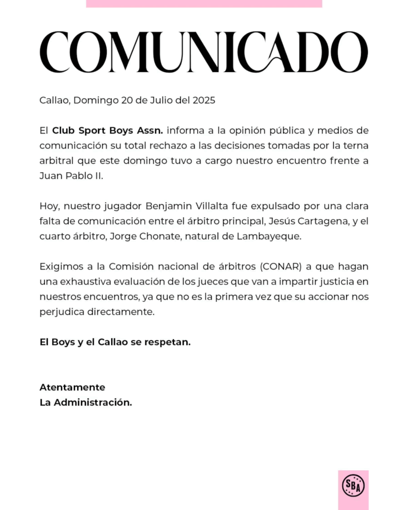 Además, Sport Boys apuntó directamente a los responsables del error: “Hoy, nuestro jugador Benjamin Villalta fue expulsado por una clara falta de comunicación entre el árbitro principal, Jesús Cartagena, y el cuarto árbitro, Jorge Chonate, natural de Lambayeque”.